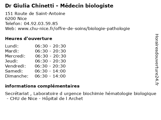 1 Dr Stéphanie Lattes - Médecin biologiste (Distance: 0,00 km) 151 Route de Saint-Antoine, 06200 Nice biologiste, consultation, docteur, dr, lattes, med, médecin, médecine, stéphanie, traitement 2 Dr Emmanuelle Thibault - Médecin biologiste (Distance: 0,00 km) 151 Route de Saint-Antoine, 06200 Nice biologiste, consultation, docteur, dr, emmanuelle, med, médecin, médecine, thibault, traitement 3 Dr Amaêl Petiton - Médecin biologiste (Distance: 0,00 km) 151 Route de Saint-Antoine, 06200 Nice amaêl, biologiste, consultation, docteur, dr, med, médecin, médecine, petiton, traitement 4 Dr Pascale Bayer - Médecin biologiste (Distance: 0,00 km) 151 Route de Saint-Antoine, 06200 Nice bayer, biologiste, consultation, docteur, dr, med, médecin, médecine, pascale, traitement 5 Pr Sophie Raynaud - Médecin biologiste (Distance: 0,00 km) 151 Route de Saint-Antoine, 06200 Nice biologiste, consultation, docteur, med, médecin, médecine, pr, raynaud, sophie, traitement 6 Dr Ghislaine Bernard - Biologiste (Distance: 1,50 km) 151 route Saint-Antoine de Ginestière, 06202 Nice analyse, bernard, biochimie, biochismiste, biologie, biologiste, dr, ghislaine, hôpital, l’archet |