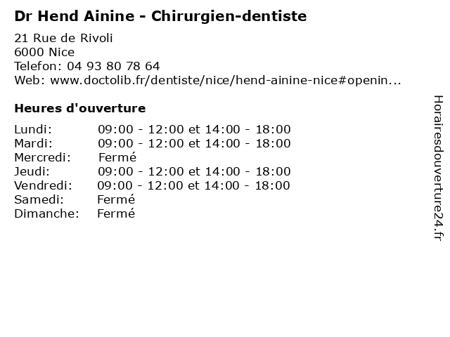1 Hend Charfeddine - Psychologue (Distance: 0,82 km) 8 Rue Oscar II, 06000 Nice charfeddine, hend, psy, psychiatre, psychologue, sante, soins 2 Dr Hend Ainine - Chirurgien-dentiste - secrétariat (Distance: 16,92 km) 11 Avenue Thiers, 06600 Antibes ainine, chirurgien, consultation, dentiste, docteur, dr, hend, med, médecin, médecine, secrétariat, traitement 3 Dr Alexandra Kellner - Chirurgien-dentiste (Distance: 0,00 km) 21 Rue de Rivoli, 06000 Nice alexandra, chirurgien, dent, dentiste, docteur, dr, kellner, soins 4 Dr Jean-Baptiste Colomb - Chirurgien urologue - secrétariat (Distance: 0,09 km) 59 Boulevard Victor Hugo, 06000 Nice baptiste, chirurgien, chirurgien urologue, colomb, dr, jean, médecins, médicaments, santé, secrétariat, spécialiste, urologue 5 D Sylvain Mouraret - Parodontiste et Implantologiste (Distance: 0,13 km) 47 boulevard Victor Hugo, 06000 Nice chirurgien, dentiste, dents, docteur, et, gencives, implantologiste, mouraret, médecin, parodontiste, santé, sylvain 6 Dr Didier Le Goff - Chirurgien viscéral et digestif (Distance: 0,29 km) 39 Rue Verdi, 6000 Nice chirurgien, didier, digestif, docteur, dr, et, goff, le, sante, soins, viscéral |