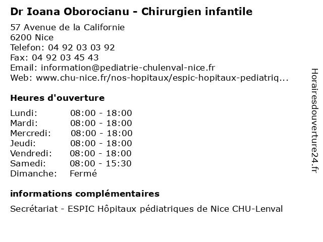 1 Dr Jean-François Lecompte - Chirurgien infantile (Distance: 0,00 km) 57 Avenue de la Californie, 06200 Nice chirurgien, consultation, docteur, dr, francois, françois, infantile, jean, lecompte, med, médecin, traitement 2 Dr Florence Griffet-Bastiani - Chirurgien infantile (Distance: 0,00 km) 57 Avenue de la Californie, 06200 Nice bastiani, chirurgien, consultation, docteur, dr, florence, griffet, infantile, med, médecin, traitement 3 Dr Ida Giurin - Chirurgien infantile (Distance: 0,00 km) 57 Avenue de la Californie, 06200 Nice chirurgien, consultation, docteur, dr, giurin, ida, infantile, med, médecin, traitement 4 Dr Jean Breaud - Chirurgien infantile (Distance: 0,00 km) 57 Avenue de la Californie, 06200 Nice breaud, chirurgien, consultation, docteur, dr, infantile, jean, med, médecin, traitement 5 CHU Nice - hémato-oncologie pédiatrique - Rhumatologie Infantile (Distance: 1,50 km) 151 Route Saint Antoine de Ginestière, 06200 Nice bureau, chu, consultation, dr, hémato, infantile, maladie, med, médecin, médecine, nice, oncologie, pratique, pédiatrique, rhumatologie, thérapie, traitement 6 Dr Ioana Suson - Chirurgien-dentiste (Distance: 2,39 km) 24 Avenue Durante, 06000 Nice cabinet, chirurgien, dentaires, dentiste, dr, ioana, santé, soins, suson |