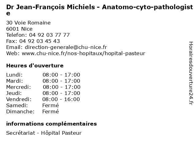1 Dr François Boutboul - Médecin biologiste (Distance: 0,00 km) 30 Voie Romaine, 06001 Nice biologiste, boutboul, consultation, docteur, dr, francois, françois, med, médecin, traitement 2 Dr Pierre-François Desmure - Médecin généraliste (Distance: 0,00 km) 30 Voie Romaine, 06001 Nice consultation, desmure, docteur, dr, francois, françois, généraliste, med, médecin, pierre, traitement 3 Dr Damien Ambrosetti - Anatomo-pathologiste (Distance: 0,00 km) 30 Avenue de la Voie Romaine, 06001 Nice ambrosetti, anatomo, andrologie, andrologue, damien, dr, hôpital, nice, pasteur, pathologiste, urologique, urologue 4 Dr Coraline Bence - Anatomo-cyto-pathologiste (Distance: 0,00 km) 30 Voie Romaine, 06001 Nice anatomo, bence, consultation, coraline, cyto, docteur, dr, med, médecin, pathologiste, traitement 5 Dr Paul Hofman - Anatomo-cyto-pathologiste (Distance: 0,00 km) 30 Voie Romaine, 06001 Nice anatomo, consultation, cyto, docteur, dr, hofman, med, médecin, pathologiste, paul, traitement 6 Dr Marius-Jean Ilie - Anatomo-cyto-pathologiste (Distance: 0,00 km) 30 Voie Romaine, 06001 Nice anatomo, consultation, cyto, docteur, dr, ilie, jean, marius, med, médecin, pathologiste, traitement |