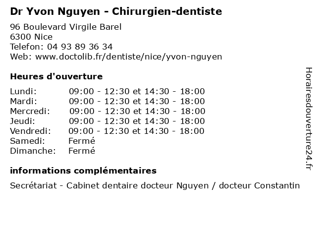1 Dr. Nguyen Kim Luan - Pédiatre (Distance: 0,68 km) 19 Boulevard Saint Roch, 06300 Nice docteur, dr., kim, luan, medecins, nguyen, pédiatre, sante 2 Dr Thi Thu Thao Nguyen - Anesthésiste (Distance: 2,17 km) 2 Avenue de Rimiez, 06100 Nice anesthésiste, consultation, docteur, dr, med, médecin, nguyen, thao, thi, thu, traitement 4 Medecin Linh Tan Nguyen (Acupuncteur) (Distance: 2,44 km) 22 Marceau, 06000 Nice acupuncteur, docteur, linh, medecin, nguyen, sante, services, tan 6 Dr Thao Nguyen - Chirurgien-dentiste (Distance: 3,22 km) 71 Boulevard de Cessole, 06100 Nice chirurgien, dent, dentiste, docteur, dr, nguyen, soins, thao |