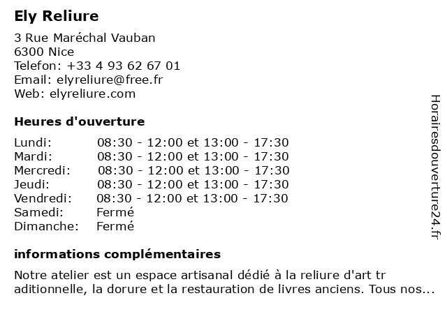| Vendredi | 08:30-12:00 et 13:00-17:30 |