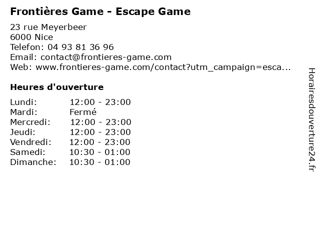 1 AVENTURE Escape Game Nice (Distance: 0,28 km) 24 Rue Meyerbeer, 06000 Nice aventure, escape, game, nice 2 Intrappola.To - Escape Game (Distance: 0,37 km) 125 rue de France, 06000 Nice agilite, ambiance, amis, copains, difficulte, enigmes, escape, facilite, famille, game, heures, histoire, intrappola.to, jeux, limites, peur, reflexion, salle, sensation, timing 3 I Lock U - Escape Game (Distance: 0,68 km) 12 rue de la Liberté, 06000 Nice agilite, ambiance, amis, copains, difficulte, enigmes, escape, facilite, famille, game, heures, histoire, jeux, limites, lock, peur, reflexion, salle, sensation, timing 4 Mysteroom - Escape Game (Distance: 1,10 km) 3 rue Oscar II, 06000 Nice agilite, ambiance, amis, copains, difficulte, enigmes, escape, facilite, famille, game, heures, histoire, jeux, limites, mysteroom, peur, reflexion, salle, sensation, timing 5 Fox In A Box - Escape Game (Distance: 1,30 km) 29 rue Delille, 06000 Nice agilite, ambiance, amis, box, copains, difficulte, enigmes, escape, facilite, famille, fox, game, heures, histoire, in, jeux, limites, peur, reflexion, salle 6 Black Out Room - Escape Game (Distance: 1,79 km) 20 avenue Pauliani, 06000 Nice agilite, ambiance, amis, black, copains, difficulte, enigmes, escape, facilite, famille, game, heures, histoire, jeux, limites, out, peur, reflexion, room, salle |