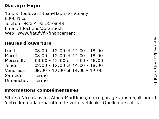 1 Fiat (Atelier) (Distance: 0,04 km) 16 Boulevard J.B. Verany, 06300 Nice atelier, automobiles, concessionnaire, fiat, garage, motos 2 Fiat (Pieces De Rechange) (Distance: 0,04 km) 16 Boulevard J.B. Verany, 06300 Nice automobiles, concessionnaire, de, fiat, garage, motos, pieces, rechange 3 Précisium (Distance: 0,56 km) 7 Rue Docteur Ardoin, 06000 Nice carrosserie, garage, précisium, services 4 Garage Polizzi - Bosch Car Service (Distance: 0,59 km) 26/28 Avenue Gallieni, 06000 Nice alternateurs, bosch, car, câbles d'allumage, démarreurs, essuie-glaces, filtres d'habitacle, filtres à air, garage, les batteries, polizzi, service 5 Garage Dubouchage - Bosch Car Service (Distance: 0,64 km) 4 Rue du Docteur Ciais, 06300 Nice alternateurs, bosch, car, câbles d'allumage, dubouchage, démarreurs, essuie-glaces, filtres d'habitacle, filtres à air, garage, les batteries, service 6 Centre Auto Speedy (Distance: 0,72 km) 14 Boulevard Saint-Roch, 06300 Nice auto, centre, entretien, garage, réparation, service, speedy |