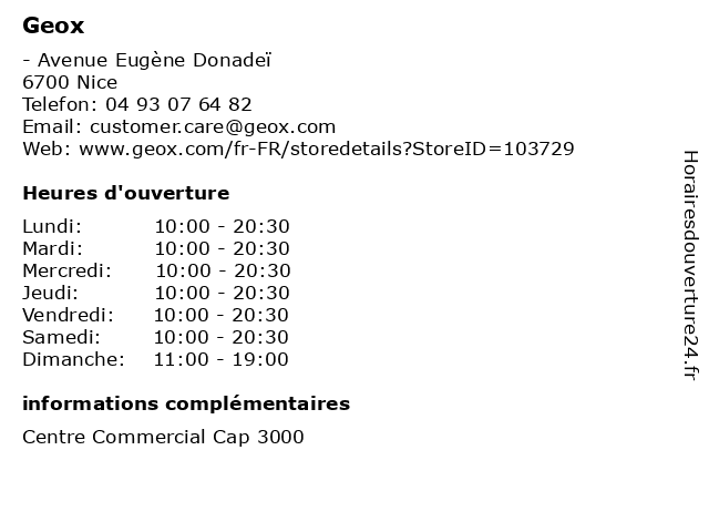 1 Geox (Distance: 7,28 km) 3 rue de la Liberté, 06000 Nice accessoires, chaussures, femme, geox, homme, italiennes, mode 2 Geox (Distance: 7,53 km) 50 Avenue Jean Médecin, 06000 Nice accessoires, chaussures, femme, geox, homme, mode 4 Geox (Distance: 28,02 km) 27 Rue de la République, 06500 Menton accessoires, chaussures, femme, geox, homme, italiennes, mode 5 Comptoir des Cotonniers (Distance: 0,00 km) - Avenue Eugène Donadeï, 06700 Saint-Laurent-du-Var beaute&sante, bijoux, chausures, comptoir, cotonniers, decoration, des, mode enfants, mode femmes, mode hommes, optique, restaurant, sport 6 Ferret (Distance: 0,00 km) - Avenue Eugène Donadeï, 06700 Saint-Laurent-du-Var beaute&sante, bijoux, chausures, decoration, ferret, mode enfants, mode femmes, mode hommes, optique, restaurant, sport |