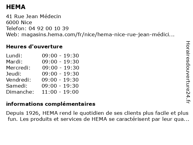 1 Hema (Distance: 0,71 km) 41 avenue Jean Médecin, 06000 Nice articles de décoration, articles de maison, hema, linges de maison, épicerie 2 HEMA (Distance: 7,37 km) 3000 Avenue Eugène Donadeï Quartier Du Lac Cc Cap, 06700 Saint-Laurent-du-Var boutique de cadeaux, hema, magasin d'articles de fête, magasin d'articles saisonniers, magasin de literie, magasin de produits cosmétiques, magasin spécialisé pour bébés, mode, papeterie 3 Assia Shop - Coiffure Afro (Distance: 0,09 km) 26 Rue De Paris, 06000 Nice accessoires, afro, assia, boutique, coiffure, cosmétiques, shop, vente 4 LUSH Cosmetics Nice (Distance: 0,27 km) 27 Avenue Jean Médecin, 06000 Nice boutique de cadeaux, cosmetics, drugstores, lush, magasin d'articles de fête, magasin de produits de soins capillaires, nice, parfumerie 5 La Compagnie du Lit (C.Cial Nice Etoile) (Distance: 0,33 km) 30 Avenue Jean Medecin, 06000 Nice alèse, c.cial, compagnie, couette, dosseret, draps, du, etoile, la, linge de lit, lit, literie, matelas, nice, oreiller, pieds de lit, sommier, surmatelas 6 Ergalis Médical Nice (Distance: 0,45 km) 21 Avenue Thiers, 06000 Nice emploi spécialisé, ergalis, intérim, médical, nice, paramédical, travail temporaire, vacation |