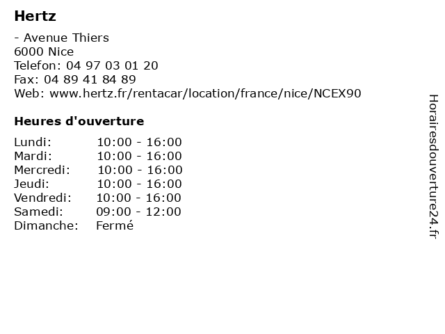 2 Hertz (Distance: 8,49 km) 1 Route du Bord de Mer, 06270 Villeneuve Loubet automobile, hertz, location de voiture, services de camionnage, voiture 3 Hertz (Distance: 17,44 km) 46 Avenue Robert Soleau, 06600 Antibes hertz, location de voitures, location longue durée, voiture, véhicules 4 Hertz (Distance: 25,17 km) 147 Rue D'Antibes, 6400 Cannes hertz, location de voitures, location longue durée, voiture, véhicules 5 Hertz - Station Essence Campanettes (Distance: 29,18 km) 13 route de Draguignan, 06130 Grasse agence, campanettes, essence, hertz, location, station, voiture 6 Hertz (Distance: 50,45 km) 32 Rue Waldeck Rousseau, 83600 Saint-Raphael agence, hertz, location, voiture |