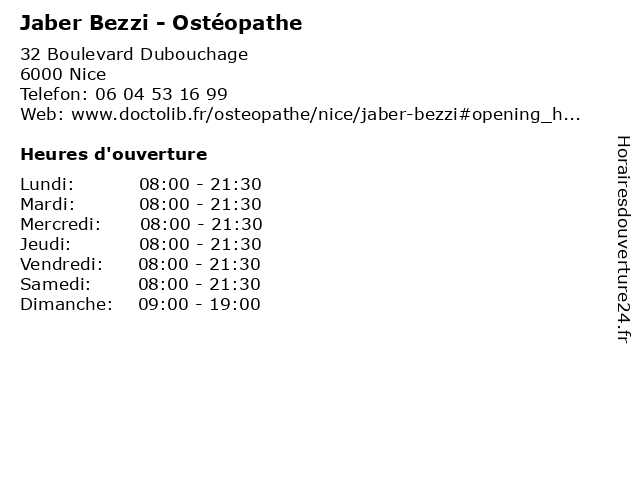 | Samedi | 08:00-21:30 |