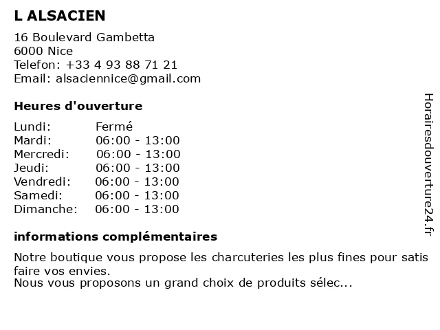 1 L'Alsacien (Distance: 24,31 km) Bt Palais Madrid a, 06000 Nice alsacien, boucheries, poissonneries