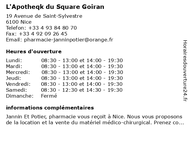 | Lundi | 08:30-13:00 et 14:00-19:30 |