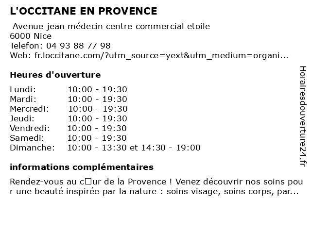 1 L'OCCITANE EN PROVENCE (Distance: 0,43 km) 8 Rue massena, 06000 Nice boutique de cadeaux, drugstores, en, l'occitane, provence 2 L'OCCITANE EN PROVENCE (Distance: 6,02 km) Aéroport de nice côte d'azur, 06206 Nice boutique de cadeaux, drugstores, en, l'occitane, provence 3 L'OCCITANE EN PROVENCE (Distance: 6,73 km) Aéroport de nice côte d'azur terminal 2, 06206 Nice boutique de cadeaux, drugstores, en, l'occitane, provence 4 L'OCCITANE EN PROVENCE (Distance: 7,49 km) Avenue Eugène Donedeuï, 06700 Saint Laurent du Var boutique de cadeaux, drugstores, en, l'occitane, provence 5 L'OCCITANE EN PROVENCE (Distance: 11,73 km) Route de vence rond-point chemin de sainte-claire, 06570 Saint Paul De Vence boutique de cadeaux, drugstores, en, l'occitane, provence 6 My Assurance - Courtier en assurance et crédit - Nice (Distance: 0,15 km) 37 Bd dubouchage, 06000 nice assurance, conseil en crédit, courtier, courtier hypothécaire, crédit, en, et, my, nice, organisme d'assurance, organisme d'assurance auto, organisme d'assurance moto, organisme d'assurance-habitation  |