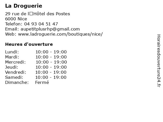 1 Droguerie Danino Cristalor (Distance: 0,37 km) 7 Rue Alexandre Mari, 06300 Nice cristalor, danino, droguerie 2 Droguerie Locapro (Distance: 19,29 km) 57 Avenue Cernuschi, 06500 Menton bricolage, droguerie, locapro, location, outillage, vente 3 ID Couture (Distance: 0,16 km) 9 Rue Foncet, 06000 Nice confection, couture, id, mercerie, retouche, vetement 4 Dr Laurence Chekroun-Le Du - Dermatologue et vénérologue (Distance: 0,23 km) 29 Boulevard Dubouchage, 06000 Nice boutons, chekroun, dermatologue, docteur, dr, du, et, laurence, le, liason, venerologue, vénérologue 5 La P'tite Couture (Distance: 0,31 km) 2 Rue Lamartine, 06200 Nice couture, la, nice, p'tite, retouche, vêtements 6 Vival (Distance: 0,40 km) 8 Rue Mascoinat, 06300 Nice droguerie, d’hypermarchés, frais, fruits et légumes, hygiène, parfumerie et autres produits non alimentaires., surgelés, vival, épicerie |