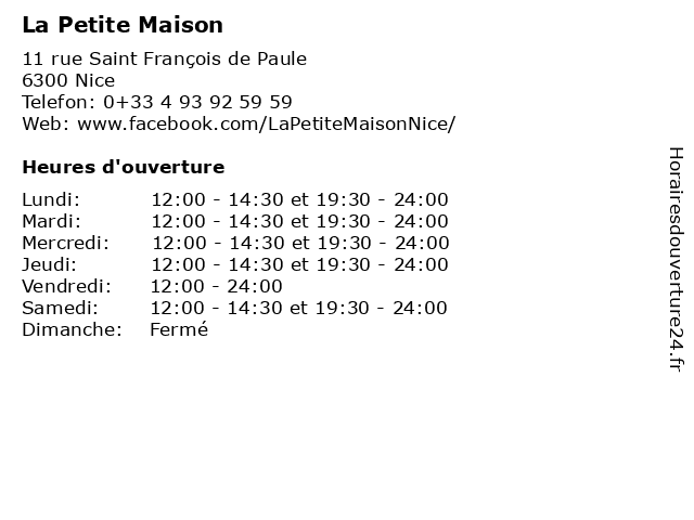 1 Restaurant La Petite Maison (Distance: 0,02 km) 11 rue Saint François de Paule, 06300 Nice drinks, foods, la, maison, petite, restaurant 2 Hôtel La Petite Sirène (Distance: 0,54 km) 8 Rue Maccarani, 06000 Nice bar, hotel, hôtel, la, petite, restaurant, service, sirène 3 La Petite Syrah (Distance: 1,08 km) 13 Rue Cassini, 06300 Nice business, coffee, la, petite, shop, syrah 4 La Petite Brasserie Niçoise (Distance: 1,20 km) 27 boulevard Raimbaldi, 06000 Nice bar, brasserie, café, la, marcau, niçoise, petite, restaurant 5 La petite ruche 2 (Distance: 3,51 km) 4 Rue Jules Michel, 06300 Nice caregivers houses, child care, family home, home care, kindergartens, la, micro-nurseries, parental home, petite, ruche 6 La Petite Cabane (Distance: 7,11 km) 29 Avenue des Filagnes, 06700 Saint-Laurent-du-Var bar, bistro, bistrot, brasserie, cabane, café, la, petite, restaurant, restauration |