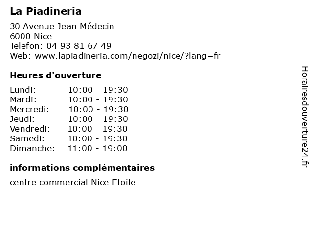 1 La Piadineria (Distance: 1,40 km) 15 boulevard Général Louis Delfino, 06300 Nice desserts, france, italien, la, menus, piadineria, plats, restaurants 2 Brioche Dorée (Distance: 0,13 km) 22 Avenue Jean Médecin, 06000 Nice boissons, brioche, desserts, dorée, salades, sandwichs, traiteur 3 Paul (Distance: 0,15 km) 3 Boulevard Victor Hugo, 06000 Nice boulanger, boulangerie, desserts, patisserie, patisseries, patissier, paul 4 Amour Vinum (Distance: 0,30 km) 24 rue Alphonse Karr, 06000 Nice accompagnement, alcool, amour, anciennete, annee, blanc, cave, caviste, desserts, doux, fort, marque, plats, rouge, subtilite, vins, vinum 5 Amour Vinum (Distance: 0,36 km) 45 rue Hôtel des Postes, 06000 Nice accompagnement, alcool, amour, anciennete, annee, blanc, cave, caviste, desserts, doux, fort, marque, plats, rouge, subtilite, vins, vinum 6 Ladurée Nice Galeries Lafayette (Distance: 0,36 km) 6 Avenue Jean Médecin, 06000 Nice boutique de desserts, galeries, ladurée, lafayette, nice |