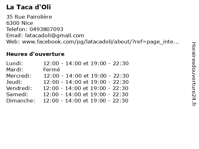 | Vendredi | 12:00-14:00 et 19:00-22:30 |