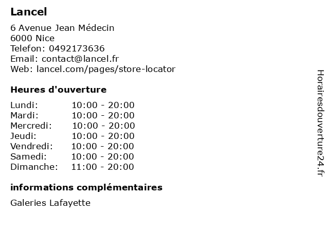 1 Lancel (Distance: 0,37 km) 30 Avenue Jean Medecin, 06000 Nice beaute, bijoux, boutiques, chausseur, enfants, lancel, maison, mode femmes, mode hommes, restaurant, sport 2 Lancel (Distance: 7,39 km) . Avenue Eugène Donadeï, 06700 Saint-Laurent du Var chaussures, femme, homme, lancel, maroquinerie, mode 3 Lancel (Distance: 12,04 km) 137 avenue des Alpes, 06800 Cagnes-sur-Mer boutique, lancel, maroquinerie, mode, sacs 4 Lancel (Distance: 25,68 km) 74 Rue d'Antibes, 06400 Cannes chaussures, femme, homme, lancel, maroquinerie, mode 5 Lancel (Distance: 25,85 km) 6 Rue du Maréchal Foch, 06400 Cannes chaussures, femme, homme, lancel, maroquinerie, mode 6 Agnès B. - Eté (Distance: 0,00 km) 6 Avenue Jean Médecin, 06000 Nice accessoires, agnès, b., chaussures, chemises, eté, mode, sacs, vêtements |