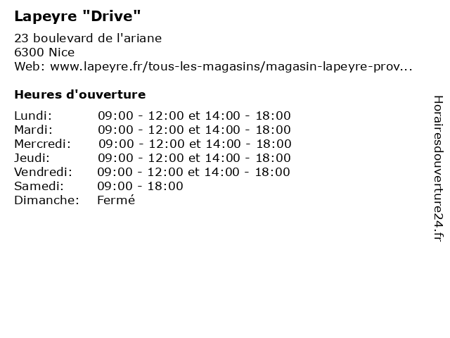 2 Chronopost - U Drive (Distance: 4,39 km) 1 Rue du 8-Mai-1945, 06310 Beaulieu-sur-Mer chronopost, drive, expédition, livraison, services 4 Casino Drive (Distance: 8,42 km) 2 Boulevard Rene Cassin, 06088 Nice beaute, bio, casino, drive, hygiene, supermarche 5 Burger King - Salle et Drive (Distance: 8,88 km) 53 boulevard des Jardiniers, 06200 Nice américain, burger, drive, et, fast, food, king, rapide, restaurant, restauration, salle, sandwichs 6 Quick (Drive) (Distance: 8,89 km) 53 Bd des Jardiniers, 06200 Nice burger, drive, hamburger, la nourriture, les boissons, les convives, quick, sandwich |