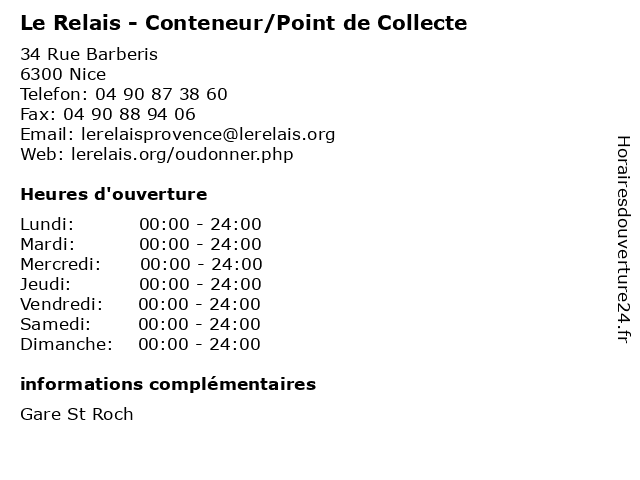 1 Le Relais - Conteneur/Point de Collecte (Distance: 0,11 km) 78 Rue Georges Ville, 06000 Nice collecte, conteneur/point, de, dons, le, point, relais, vêtements 2 Le Relais - Conteneur/Point de Collecte (Distance: 0,33 km) - Domaine de Barla, 06000 Nice collecte, conteneur/point, de, dons, le, point, relais, vêtements 3 Le Relais - Conteneur/Point de Collecte (Distance: 0,37 km) - Place Auguste Blanqui, 06000 Nice collecte, conteneur/point, de, dons, le, point, relais, vêtements 4 Le Relais - Conteneur/Point de Collecte (Distance: 0,68 km) 6 Rue Penchienatti, 06000 Nice collecte, conteneur/point, de, dons, le, point, relais, vêtements 5 Le Relais - Conteneur/Point de Collecte (Distance: 0,94 km) - Rue Tonduti de l'Escarene, 06000 Nice collecte, conteneur/point, de, dons, le, point, relais, vêtements 6 Le Relais - Conteneur/Point de Collecte (Distance: 1,22 km) - Rue Pastorelli, 06000 Nice collecte, conteneur/point, de, dons, le, point, relais, vêtements |