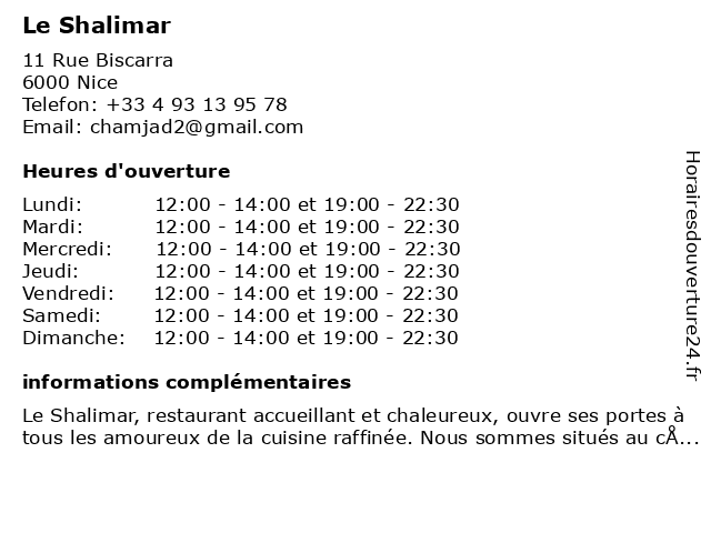Le Shalimar, restaurant accueillant et chaleureux, ouvre ses portes à tous les amoureux de la cuisine raffinée. Nous sommes situés au cÅ?ur de la ville et nous sommes heureux d'offrir un accueil...