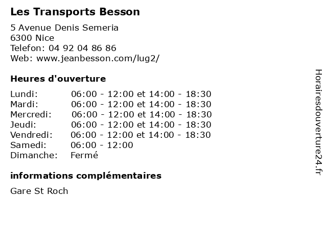 | Lundi | 06:00-12:00 et 14:00-18:30 |