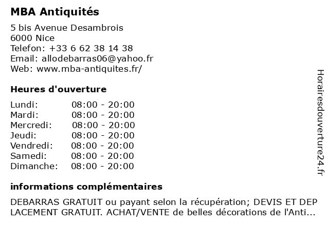 2 Maître Jean de dieu Mba Nze - Avocat (Distance: 0,53 km) 28 Boulevard Raimbaldi, 06000 Nice avocat, avocats, civils, de, dieu, droits, jean, juridiques, maître, mba, nze 3 Maître Rose Mba-N. Kamagne - Avocate (Distance: 0,58 km) 45 avenue Jean Medecin, 06000 Nice avocate, avocats, civils, droits, juridiques, kamagne, maître, mba, n., rose 4 Harter Antiquités du XXe siècle (Distance: 1,10 km) 36 Rue Catherine Segurane, 06300 Nice antiquités, art, artists, du, gallery, harter, photos, siècle, xxe 5 Eric Klein - Magasin d'antiquités (Distance: 1,17 km) 4 Rue de Foresta, 06300 Nice antiquité, art, d'antiquités, eric, galerie, klein, luminaire, magasin, nice, sculpture 6 Récamier Antiquités (Distance: 1,48 km) 50 Rue de France, 06000 Nice anciens, antiquaire, antiquité, antiquités, objets, récamier, tableaux |