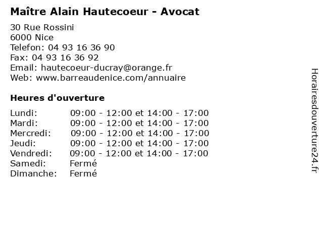 1 Maître Stéphanie Hobsterdre-Hautecoeur - Avocate (Distance: 0,00 km) 30 rue Rossini, 06000 Nice avocate, avocats, civils, droits, hautecoeur, hobsterdre, juridiques, maître, stéphanie 2 Dr Alain Gottiniaux - Gastro-entérologue (Distance: 0,44 km) 14 Rue Châteauneuf, 06000 Nice alain, clinic, doctor, dr, entérologue, gastro, gastroenterologist, gottiniaux, health care 3 Restaurant La Cantine Bio d'Alain Alexanian (Distance: 0,53 km) 3 avenue des Fleurs, 06300 Nice alexanian, bio, cantine, d'alain, drinks, foods, la, restaurant 4 Alain Afflelou Acousticien (Distance: 0,81 km) 24 Avenue Jean Medecin, 06000 Nice acousticien, afflelou, aide auditive, alain, appareil auditif, prothèses auditive 5 Alain Thiry Osteopathie Vertiges (Distance: 0,84 km) 29 Boulevard Dubouchage, 06000 Nice alain, massage et spa, osteopathie, sauna, thiry, vertiges 6 Green Acres - Bergel Alain (Distance: 4,72 km) 133 Av Ste Marguerite, 06200 Nice acres, agency, agent, alain, apartment, bergel, green, home, real estate |
