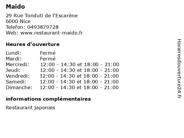 | Dimanche | 12:00-14:30 et 18:00-21:00 |