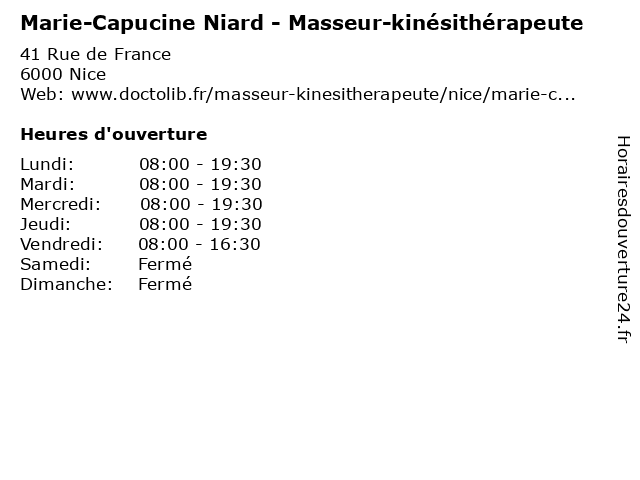 2 AZUR LOISIR CAMPING CAR (Distance: 29,10 km) 1189 Chemin de la Levade, 06550 La Roquette-sur-Siagne azur, camping, camping car 83, camping car cote d'azur, capucine 06, car, dethless 06, fourgon 06, loisir, occasion 06 et 83, profilé 06, réparation et gardiennage de véhicules, sunlight 06, vente camping car neuf occasions 3 Romain Varaschini - Masseur-kinésithérapeute (Distance: 0,00 km) 41 Rue de France, 06000 Nice docteur, kine, kinesitherapeute, kinésithérapeute, masseur, romain, varaschini 4 Noémie Queguiner - Masseur-kinésithérapeute (Distance: 0,00 km) 41 Rue de France, 06000 Nice kiné, kinésithérapeute, masseur, noémie, queguiner, rééducation, soin 5 François-Xavier Rougai - Masseur-kinésithérapeute (Distance: 0,00 km) 41 Rue de France, 06000 Nice docteur, françois, kinésithérapeute, masseur, médecin, médecine, rougai, secrétariat, secrétariatusi, xavier 6 Julie Hanon - Masseur-kinésithérapeute (Distance: 0,01 km) 41 Rue de France, 06000 Nice hanon, julie, kiné, kinésithérapeute, masseur, rééducation, soin |
