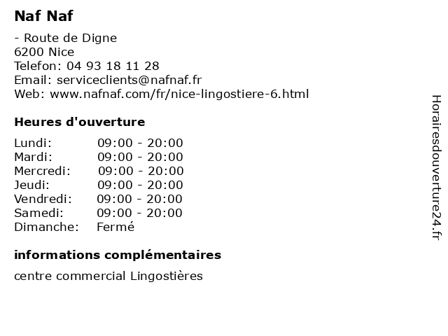 1 Naf Naf (Distance: 1,38 km) 24 Avenue Jean Médecin, 06000 Nice accessoires, chic, femme, naf, prêt à porter 2 3 Naf Naf (Distance: 6,17 km) - Avenue Eugène Donadeï, 06700 Saint-Laurent-du-Var beauté, cosmétique, maquillage, naf, parfumerie, soins 4 Naf Naf (Distance: 11,41 km) Marina 7, 06270 Villeneuve Loubet accessoires, divers, habillement, magasins, naf 6 Naf Naf (Distance: 13,79 km) 27 avenue Albert II, 98000 Monaco accessoires, boutique, femme, habillement, mode, naf |
