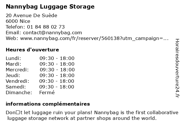 2 Nannybag Luggage Storage (Distance: 0,36 km) 5 Boulevard Victor Hugo, 06000 Nice luggage, nannybag, storage 3 Nannybag Luggage Storage (Distance: 0,36 km) 37 Rue De La Buffa, 06000 Nice luggage, nannybag, storage 4 Nannybag Luggage Storage (Distance: 0,43 km) 34 Rue De La Buffa, 06000 Nice luggage, nannybag, storage 5 6 Nannybag Luggage Storage (Distance: 0,89 km) 28 Rue D'angleterre, 06000 Nice luggage, nannybag, storage |