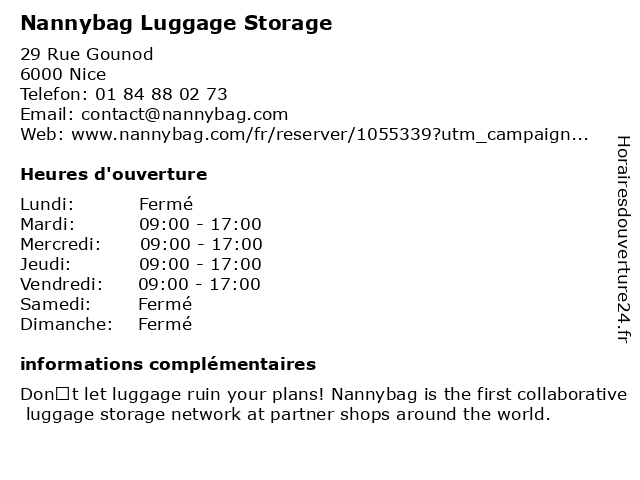1 Nannybag Luggage Storage (Distance: 0,37 km) 40 Boulevard Gambetta, 06000 Nice luggage, nannybag, storage 2 3 Nannybag Luggage Storage (Distance: 0,50 km) 34 Rue De La Buffa, 06000 Nice luggage, nannybag, storage 4 Nannybag Luggage Storage (Distance: 0,51 km) 28 Rue D'angleterre, 06000 Nice luggage, nannybag, storage 5 Nannybag Luggage Storage (Distance: 0,51 km) 5 Boulevard Victor Hugo, 06000 Nice luggage, nannybag, storage 6 Nannybag Luggage Storage (Distance: 0,51 km) 37 Rue De La Buffa, 06000 Nice luggage, nannybag, storage |