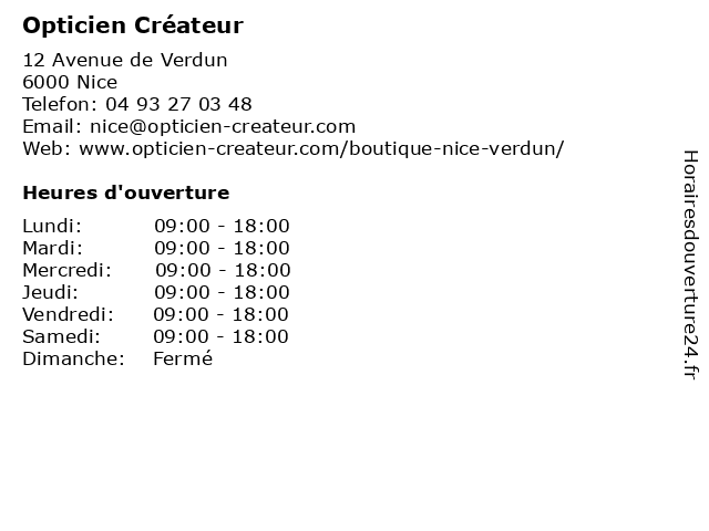 1 Opticien Créateur (Distance: 1,22 km) 8 rue Bonaparte, 06300 Nice créateur, lentille, lunette, monture, opticien, optique 2 Opticien Créateur (Distance: 7,19 km) - Avenue Eugène Donadeï, 06700 Saint-Laurent-du-Var créateur, lentille, lunette, monture, opticien, optique 3 Opticien Créateur (Distance: 13,43 km) 25 Avenue de la Costa, 98000 Monaco créateur, lentille, lunette, monture, opticien, optique 4 Opticien Créateur (Distance: 17,00 km) 25 Rue Aubernon, 06600 Antibes créateur, lentille, lunette, monture, opticien, optique 5 Opticien Nice - Optic 2000 (Distance: 0,33 km) 8 Rue de France, 06000 Nice 2000, lentilles de contact, lunettes de soleil, lunettes de vue, nice, optic, optic2000, opticien, opticien optic2000, ray-ban, rayban 6 Opticien Mobile -NICE Optical Center (Distance: 0,34 km) 2 Rue Raynardi, 06000 Nice center, mobile, nice, optical, opticien |