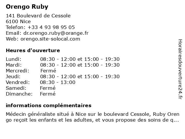 2 Maître Céline Orengo - Avocate (Distance: 3,13 km) 2 rue Gustave Deloye, 06000 Nice avocate, avocats, civils, céline, droits, juridiques, maître, orengo 4 Dr Jacques Orengo - Médecin généraliste (Distance: 31,75 km) 195 Avenue Janvier Passero, 06210 Mandelieu-la-Napoule docteur, dr, generaliste, généraliste, jacques, medecin, médecin, orengo, soins |