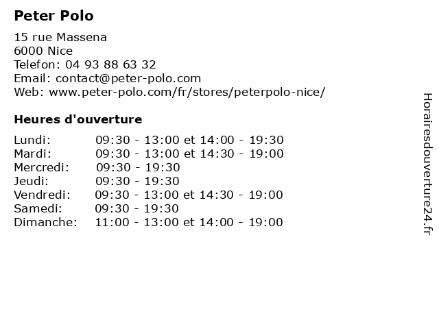 1 Dr Peter Cumbo - Chirurgien plasticien et esthétique (Distance: 0,72 km) 17 Avenue Auber, 06000 Nice chirurgien, cumbo, dr, esthétique, et, peter, plasticien 2 Façonnable (Distance: 13,74 km) 23 Boulevard des Moulins, 98000 Monaco accessoirs, boutique, chemises, façonnable, homme, modes, polo, sous-vêtements 3 Peter Polo (Distance: 20,69 km) 45 avenue Félix Faure, 06500 Menton accessoires, boutique, habillement, mode, peter, polo, vêtements 4 Ralph Lauren Store (Distance: 25,48 km) 61 Boulevard de la Croisette, 06400 Cannes accessoires, lauren, marque, polo, ralph, store, vêtements 5 Polo Ralph Lauren Cannes Rue d'Antibes (Distance: 25,63 km) 63-65 Rue D'antibes, 06400 Cannes cannes, d'antibes, lauren, magasin de vêtements pour hommes, polo, ralph, rue 6 Dr Peter Bornebusch - Chirurgien-dentiste (Distance: 28,78 km) 1 Avenue de la Libération, 06130 Grasse bornebusch, chirurgien, dentaire, dentiste, dr, implantologie, parodontologie, peter |
