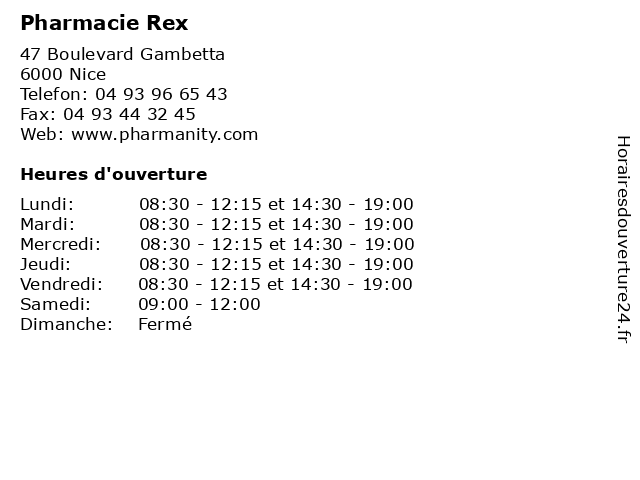 1 Rex nettoyage (Distance: 1,21 km) 3 Rue Diderot, 06000 Nice nettoyage, professionnalisme, propreté, rex, service, services de nettoyage 2 Rex Rotary (Distance: 10,47 km) 5 chemin des Presses, 06800 Cagnes-sur-Mer entreprise, informatique, matériel, rex, rotary, télécommunication 3 Pharmacie Cilenti (Distance: 0,52 km) 32 Avenue Georges Clemenceau, 06000 Nice cilenti, herboristerie, médicaments, paramédical, parapharmacie, pharmacie, pharmacien, santé, traitements 4 Pharmacie des Beaumettes (Distance: 0,79 km) 134 Rue de France, 06000 Nice beaumettes, des, herboristerie, médicaments, paramédical, parapharmacie, pharmacie, pharmacien, santé, traitements 5 Pharmacie Bergel la Grande (Distance: 0,95 km) 10 Rue Massena, 06000 Nice bergel, grande, herboristerie, la, médicaments, paramédical, parapharmacie, pharmacie, pharmacien, santé, traitements 6 Pharmacie Massena (Distance: 1,02 km) 7 Rue Massena, 06000 Nice herboristerie, massena, médicaments, paramédical, parapharmacie, pharmacie, pharmacien, santé, traitements |