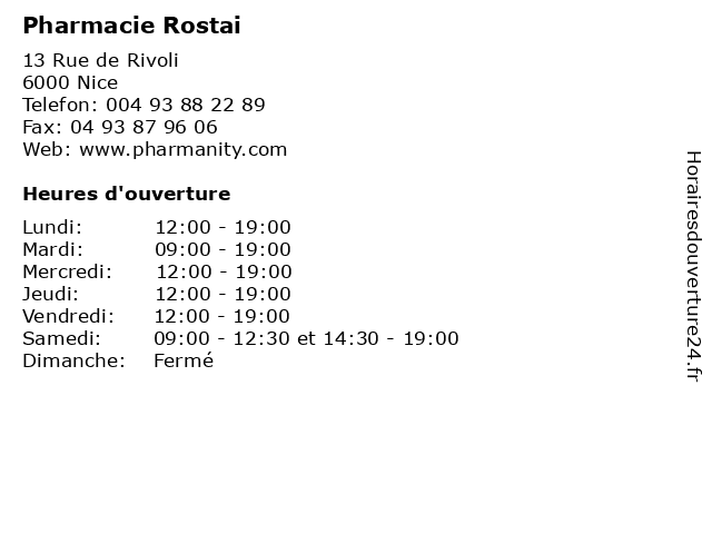 1 Pharmacie de Rivoli (Distance: 0,02 km) 13 rue de Rivoli, 06000 Nice de, la guérison, la médecine, la pharmacie, la santé, les soins, pharmacie, rivoli 2 Pharmacie Nice Etoile (Distance: 1,02 km) 30 Avenue Jean Medecin, 06000 Nice beaute, bijoux, boutiques, chausseur, enfants, etoile, maison, mode femmes, mode hommes, nice, pharmacie, restaurant, sport 3 1001Pharmacies / Pharmacie Riviera (Distance: 1,17 km) 66 Avenue Jean Medecin, 06000 Nice 1001pharmacies, la médecine, la pharmacie, la santé, les soins, pharmacie, riviera 4 1001Pharmacies / Pharmacie des Vosges (Distance: 1,43 km) 136 Bd Gambetta, 06000 Nice 1001pharmacies, des, la médecine, la pharmacie, la santé, les soins, pharmacie, vosges 5 1001Pharmacies / Pharmacie Vauban (Distance: 2,79 km) 57 Route de Turin, 06000 Nice 1001pharmacies, la médecine, la pharmacie, la santé, les soins, pharmacie, vauban 6 1001Pharmacies / Pharmacie Jannin Potier (Distance: 3,33 km) 26 Avenue Saint Sylvestre, 06100 Nice 1001pharmacies, jannin, la médecine, la pharmacie, la santé, les soins, pharmacie, potier |