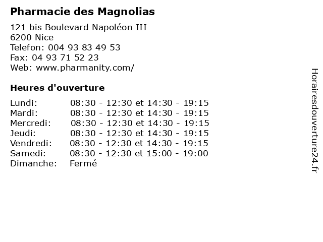 1 Pharmacie des Magnolias (Distance: 0,05 km) 121 Boulevard Napoléon III, 06200 Nice des, herboristerie, magnolias, médicaments, paramédical, parapharmacie, pharmacie, pharmacien, santé, traitements 2 École élémentaire publique Magnolias 1 (Distance: 0,06 km) 135 Boulevard Napoléon III, 06200 Nice cours, education, magnolias, publique, services, école, élémentaire 3 École Maternelle Publique Magnolias (Distance: 0,06 km) 135 Boulevard Napoléon III, 06200 Nice cours, education, magnolias, maternelle, publique, services, École, école 4 École Maternelle Publique Les Magnolias (Distance: 7,30 km) 2 Rue des Galères, 06230 Villefranche-sur-Mer cours, education, les, magnolias, maternelle, publique, services, école 5 Pharmacie de la Madeleine (Distance: 2,33 km) 12 Boulevard de la Madeleine, 06000 Nice de, herboristerie, la, madeleine, médicaments, paramédical, parapharmacie, pharmacie, pharmacien, santé, traitements 6 Pharmacie des Beaumettes (Distance: 2,73 km) 134 Rue de France, 06000 Nice beaumettes, des, herboristerie, médicaments, paramédical, parapharmacie, pharmacie, pharmacien, santé, traitements |