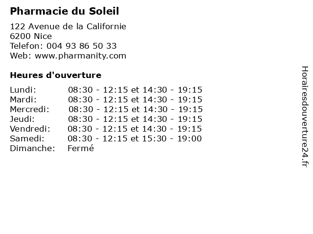 1 1001Pharmacies / Pharmacie du Soleil (Distance: 0,01 km) 122 Ave de la Californie, 06200 Nice 1001pharmacies, du, la médecine, la pharmacie, la santé, les soins, pharmacie, soleil 2 Green Acres - Côté Soleil Immobilier (Distance: 1,64 km) 48 Route De Canta Galet, 06200 Nice acres, agency, agent, apartment, côté, green, home, immobilier, real estate, soleil 3 Mutuelles du Soleil (Distance: 3,15 km) 34 Rue Pastorelli, 06000 Nice assurance, du, mutuelle, mutuelles, sante, services, soleil 4 Mutuelles du Soleil (Distance: 3,20 km) 30 Rue Pastorelli, 06000 Nice assurance, du, mutuelle, mutuelles, sante, services, soleil 5 Mutuelles du Soleil (Centre Optique) (Distance: 3,20 km) 30 Rue Pastorelli, 06000 Nice assurance, centre, du, mutuelle, mutuelles, optique, sante, services, soleil 6 Les Clôtures du Soleil (Distance: 4,44 km) 1853 Avenue Pierre et Marie Curie, 06700 St Laurent du Var clotures, clôtures, du, les, lippi, portails, soleil |
