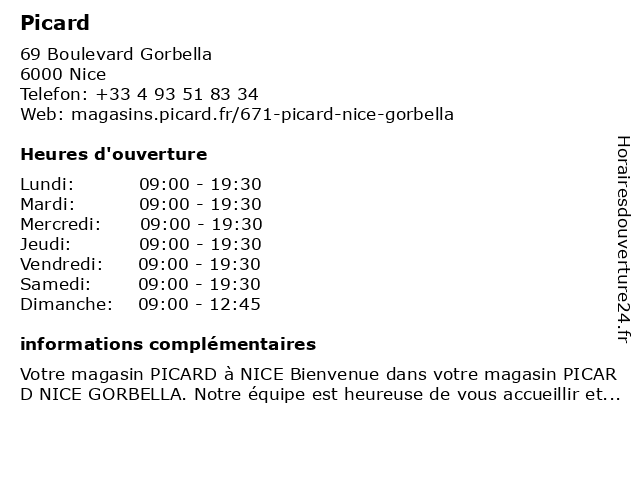 Votre magasin PICARD à NICE Bienvenue dans votre magasin PICARD NICE GORBELLA. Notre équipe est heureuse de vous accueillir et pourra vous conseiller avec professionnalisme et en toute simplicit...