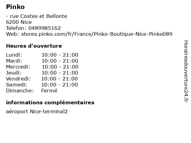 1 Pinko (Distance: 1,51 km) - Avenue Eugène Donadeï, 06700 Saint-Laurent-du-Var accessoires, magasins, pinko, prêt à porter, vêtements 2 Pinko (Distance: 5,77 km) 4 Rue Longchamp, 06000 Nice accessoires, mode, pinko, prêt-à-porter, vêtements 3 Pinko (Distance: 5,90 km) 6 Avenue Jean Médecin, 06270 Nice accessoires, boutique, galeries, lafayette, mode, nice, pinko, sacs, vêtements 4 Pinko (Distance: 19,86 km) 23 Rue du Commandant André, 06400 Cannes accessoires, divers, exploitation, habillement, magasins, pinko, societe, vetement 5 Liu Jo (Distance: 0,15 km) 49 Rue Costes et Bellonte, 06200 Nice accesoires, boutique, jo, liu, mode, vetements 6 |