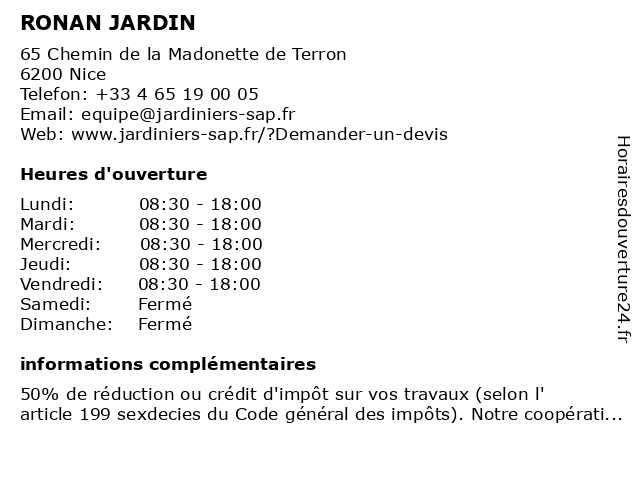 1 Jardin Molinari (Distance: 2,21 km) 251 Route de Canta Galet, 06200 Nice entretien, jardin, molinari, nice, service 3 Jardin de France (Distance: 2,61 km) 5 Rue Dante, 06000 Nice boissons, commerce, de, france, fruits, jardin, légumes, miel, produits locaux, vente, épicerie 4 C' du Jardin - Bar à Salades (Distance: 2,71 km) 10 boulevard Gambetta, 06000 Nice bar, boissons, c', du, jardin, restaurant, restauration, salades, sandwich 5 Snack Coté Jardin (Distance: 3,10 km) 405 Promenade des Anglais, 06200 Nice coté, cuisine, jardin, menus, repas, restaurants, snack 6 Le Jardin de Mozart (Distance: 3,16 km) 19 avenue Auber, 06000 Nice bouquets, composition, de, fleuriste, fleurs, jardin, le, mozart, plantes |
