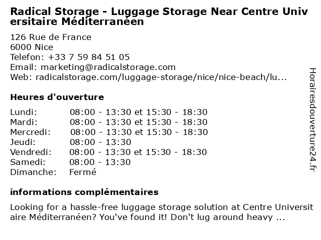 1 Nannybag Luggage Storage - Promenade des Anglais (Distance: 0,00 km) 126 Rue De France, 06000 Nice anglais, des, luggage, nannybag, promenade, storage 2 Luggage Storage Centre Universitaire Méditerranéen - Radical Storage (Distance: 0,01 km) 126 Rue de France, 06000 Nice centre, luggage, luggage storage, luggage storage near me, méditerranéen, radical, storage, universitaire 3 Nannybag Luggage Storage - CLOSED (Distance: 0,39 km) 45 Bd François Grosso, 06000 Nice closed, luggage, nannybag, storage 5 Luggage Storage Bd François Grosso - Radical Storage (Distance: 0,42 km) 49 Boulevard François Grosso, 06000 Nice bd, françois, grosso, luggage, luggage storage, luggage storage near me, radical, storage 6 Luggage Storage Rue Châteauneuf - Radical Storage (Distance: 0,74 km) 40 Rue Châteauneuf, 06000 Nice châteauneuf, luggage, luggage storage, luggage storage near me, radical, rue, storage |