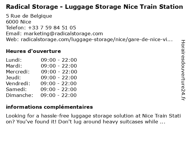 1 2 Nannybag Luggage Storage (Distance: 0,06 km) 28 Rue D'angleterre, 06000 Nice luggage, nannybag, storage 3 Radical Storage - Luggage Storage Nice Ville Station (Distance: 0,06 km) 10 Rue de Belgique, 06000 Nice luggage, luggage storage, luggage storage near me, nice, radical, station, storage, ville 4 Luggage Storage - Prom'Kavkaz (Distance: 0,07 km) 13 rue de Belgique, 06000 Nice alimentation, boissons, gâteaux, luggage, prom'kavkaz, storage, épicerie 6 Luggage Storage Mosquée De La Gare - Radical Storage (Distance: 0,19 km) 4 Rue de la Reine Jeanne, 06000 Nice de, gare, la, luggage, luggage storage, luggage storage near me, mosquée, radical, storage |