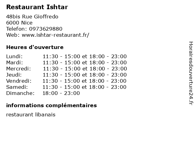 | Samedi | 11:30-15:00 et 18:00-23:00 |
