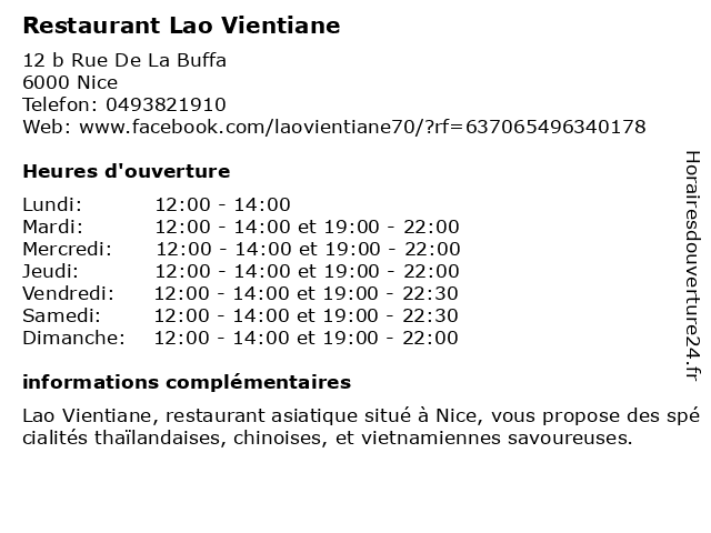 | Vendredi | 12:00-14:00 et 19:00-22:30 |