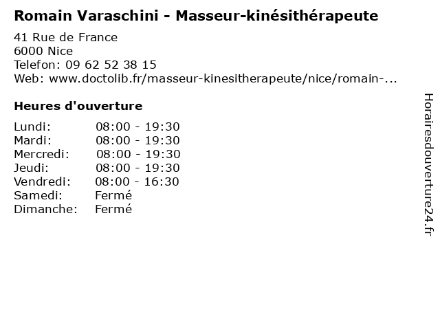 1 Maître Romain Toesca - Avocat (Distance: 0,38 km) 54 boulevard Victor Hugo, 06000 Nice avocat, avocats, civils, droits, juridiques, maître, romain, toesca 2 Romain Marchal - Ostéopathe (Distance: 0,41 km) 6 Boulevard Gambetta, 06000 Nice marchal, osteo, osteopathe, ostéopathe, romain, sante, soins 3 Dr Romain Sassus - Psychiatre (Distance: 0,89 km) 54 Rue Gioffredo, 06000 Nice dr, folie, psychiatre, psychiatrie, psychiatrique, romain, sassus 4 Romain Plomberie Entreprise (Distance: 1,09 km) 48 boulevard Jean Jaurès, 06300 Nice entreprise, plomberie, romain 5 Bibliothèque Romain Gary (Distance: 1,12 km) 21 Boulevard Dubouchage, 06000 Nice bibliothèque, gary, libraire, livre, médiathèque, romain, services 6 Dr Romain Ceinos - Chirurgien-dentiste (Distance: 1,28 km) 5 rue Pierre Dévoluy, 06006 Nice ceinos, chirurgien, dentaire, dentiste, dr, hôpital, implantologie, orthodontiste, parodontologie, roch, romain, saint |