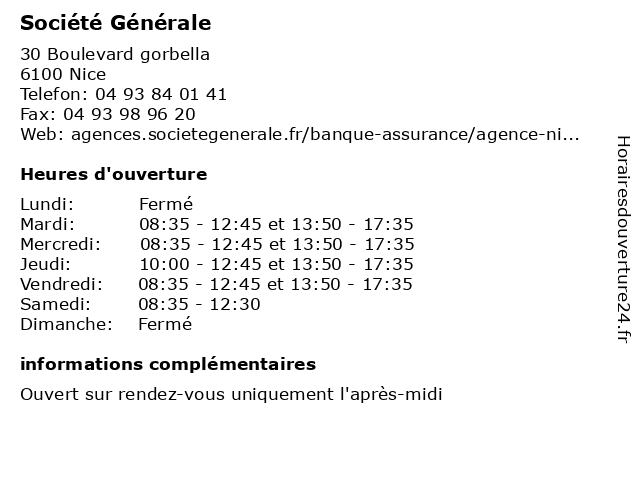 1 Société Générale (Distance: 0,46 km) 1 Place Alexandre Medecin, 06100 Nice agence, devis d'assurance automobile, générale, prêt à domicile, prêt à la consommation, société 2 Société Générale (Distance: 1,50 km) 112 Boulevard gambetta, 06000 Nice association d'épargne et de crédit, atm, conseil en crédit, générale, organisme d'assurance auto, organisme d'assurance moto, organisme d'assurance-habitation, organisme d'assurance-vie, société 3 Société Générale (Distance: 5,74 km) 78 Boulevard Napoléon III, 06200 Nice agence, devis d'assurance automobile, générale, prêt à domicile, prêt à la consommation, société 4 Société Générale (Distance: 6,16 km) 1 Boulevard Maréchal Joffre, 06310 Beaulieu-sur-Mer association d'épargne et de crédit, atm, conseil en crédit, générale, organisme d'assurance auto, organisme d'assurance moto, organisme d'assurance-habitation, organisme d'assurance-vie, société 5 Société Générale (Distance: 6,33 km) 44 Boulevard du Général Leclerc, 06310 Beaulieu-sur-Mer banques, commerciales, generale, générale, nationales, societe, société 6 Société Générale (Distance: 8,32 km) - Avenue Eugène Donadeï, 06700 Saint-Laurent-du-Var assurance, banque, générale, prêt, service, société  |
