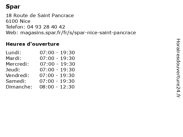1 Spar (Distance: 2,09 km) 9 Place Général Goiron, 06100 Nice alimentation, légumes et de fruits, spar, épicerie 2 Spar (Distance: 2,18 km) 507 Route de Bellet, 06200 Nice alimentation, légumes et de fruits, spar, épicerie 3 Spar (Distance: 3,01 km) - Place Alexandre Medecin, 06100 Nice alimentation, légumes et de fruits, spar, épicerie 4 SPAR (Distance: 3,89 km) 8 AVENUE BORRIGLIONE, 06000 Nice alimentation, légumes et de fruits, spar, épicerie 5 Spar (Distance: 3,99 km) 191 Boulevard de la Madeleine, 06000 Nice alimentation, légumes et de fruits, spar, épicerie 6 Spar (Distance: 5,38 km) 2 Rue Maccarani, 06100 Nice alimentaire, alimentation, courses, spar, supermarché, supérette, épicerie |