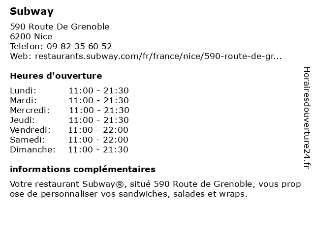 1 Subway (Distance: 2,35 km) 16 Rue Jules Bianchi, 06200 Nice fast-food, restaurant à emporter, restaurants, subway 3 Subway (Distance: 6,62 km) 6 Rue De Suisse, 06200 Nice fast-food, restaurant à emporter, restaurants, subway 6 Subway (Distance: 7,67 km) 22 Boulevard Jean-jaures, 06000 Nice fast-food, restaurant à emporter, restaurants, subway |