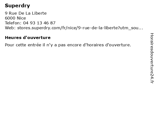 1 SuperDry (Distance: 11,81 km) 119 Avenue Des Alpes, 06800 Cagnes Sur Mer accessoires, mode, superdry, vêtements 2 Superdry (Distance: 12,00 km) Polygon Riviera Unit C2 Zac Saint John District, 06800 Cagnes-sur-Mer magasin de vêtements pour femmes, magasin de vêtements pour hommes, superdry 6 |